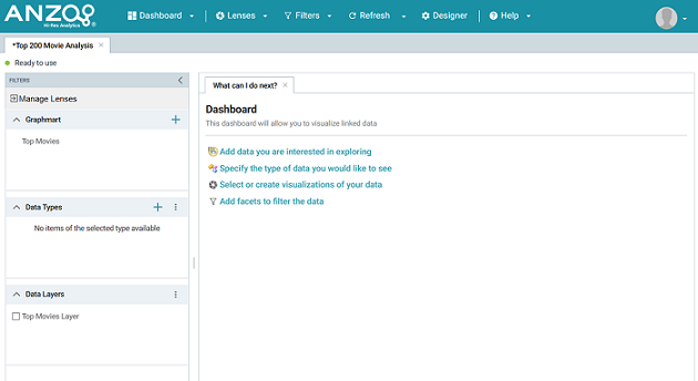 - Click Finish to create the dashboard. The new Dashboard appears as a new tab on the screen and contains a sub-tab titled What can I do next?. This tab acts as a wizard to guide you through the initial Dashboard creation. Anzo populates the Graphmart and Data Layers panels with the sample movie data graphmart name and default layer for the graphmart.