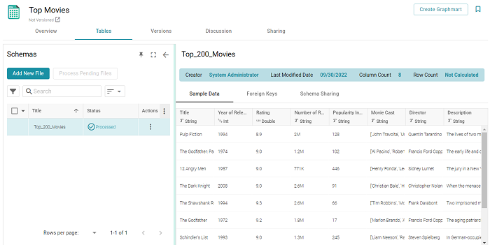 - Click the Process Pending Files button to import the data to Anzo. Anzo imports the data and the status changes to Processed. Additional buttons are also displayed on the right side of the screen. You can click the table row for Top_200_Movies to display the schema details.
