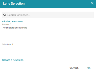 - To create a Table lens, click the Select or create visualizations of your data link on the What can I do next tab. Anzo displays the Lens Selection dialog box. Since lenses have not been created previously, the list of lenses is empty: