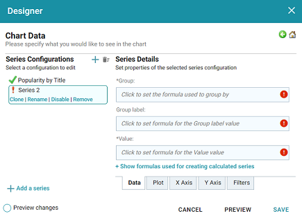 - Under Series 2, click Rename and specify a name for the series, such as "Reviews by Title." Then click the Group field on the right side of the screen and select the Title property from the drop-down list. Click Close to close the list.