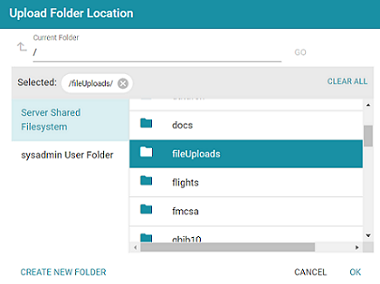 If your Upload To location is configured to upload the file to the server installation path, it is important to click Change and select another upload location that is on the shared File Store. For example, the image below shows the Upload Folder Location dialog box that is presented after clicking Change. A folder called fileUploads is selected on the File Store.