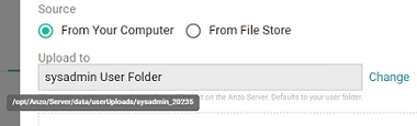- As a best practice, check the upload location that is listed in the Upload To field by hovering your pointer over the value to view the tooltip. Make sure the upload location is a directory on the shared File Store and not a location in the server installation path. If the file is not uploaded to the shared File Store it is not accessible by applications like AnzoGraph. In addition, other users cannot publish pipelines for the Data Source because they typically do not have access to the file.